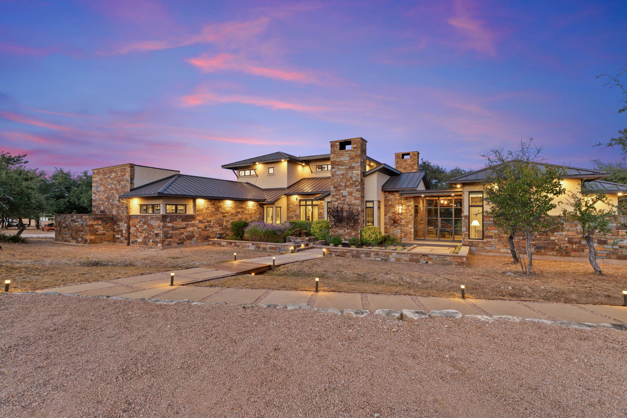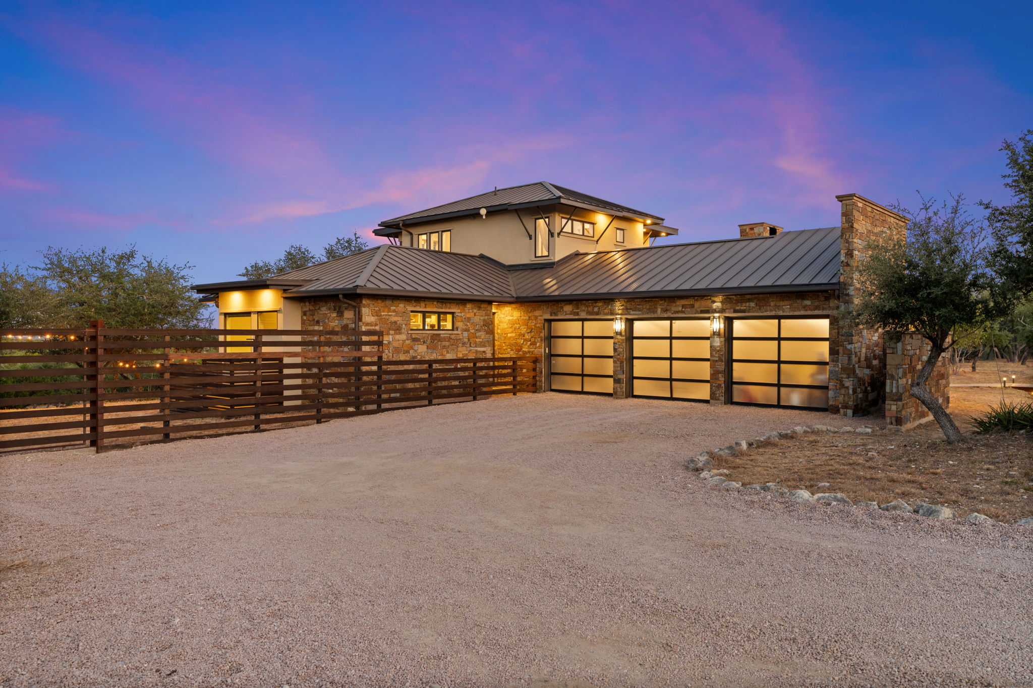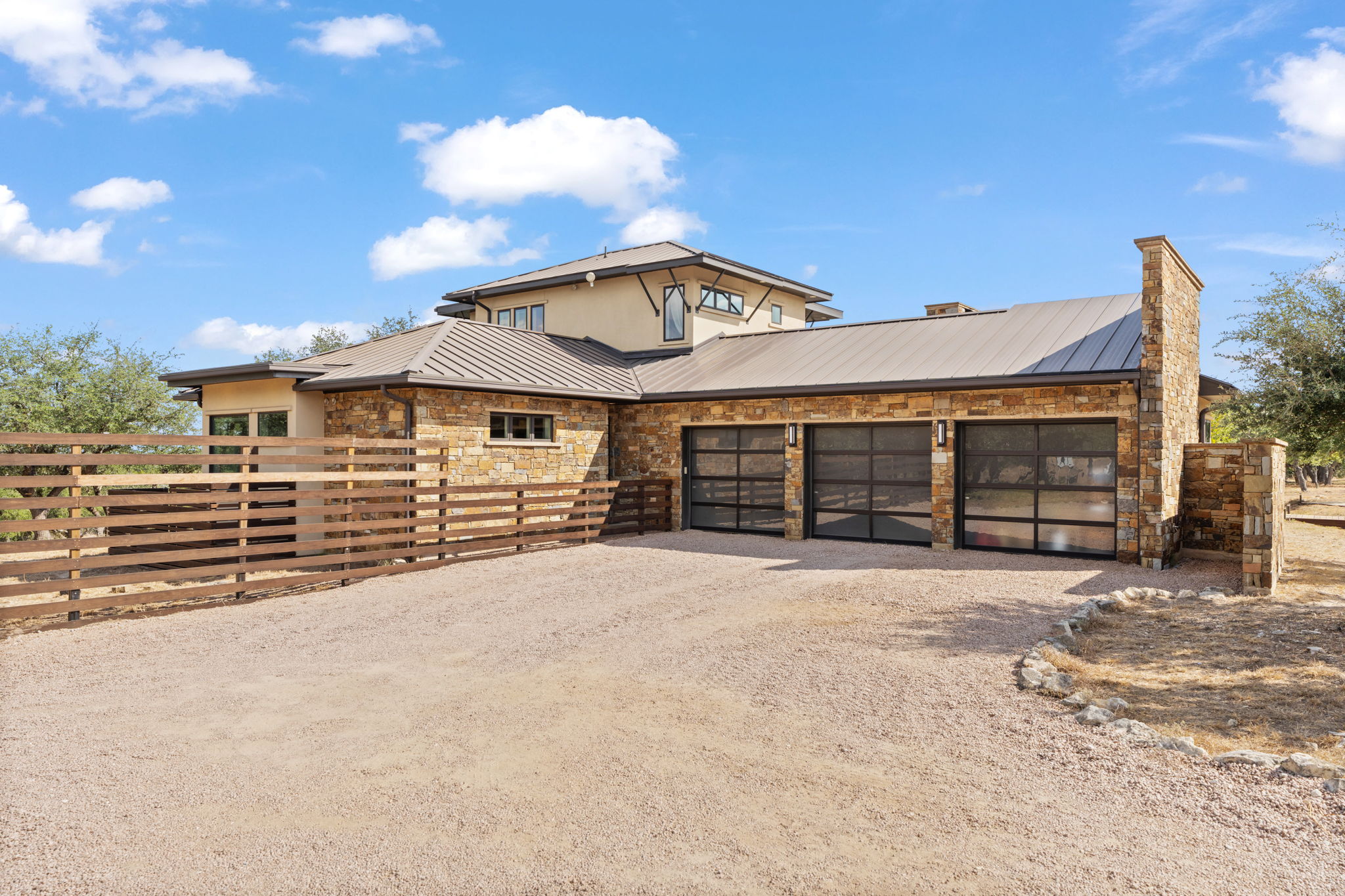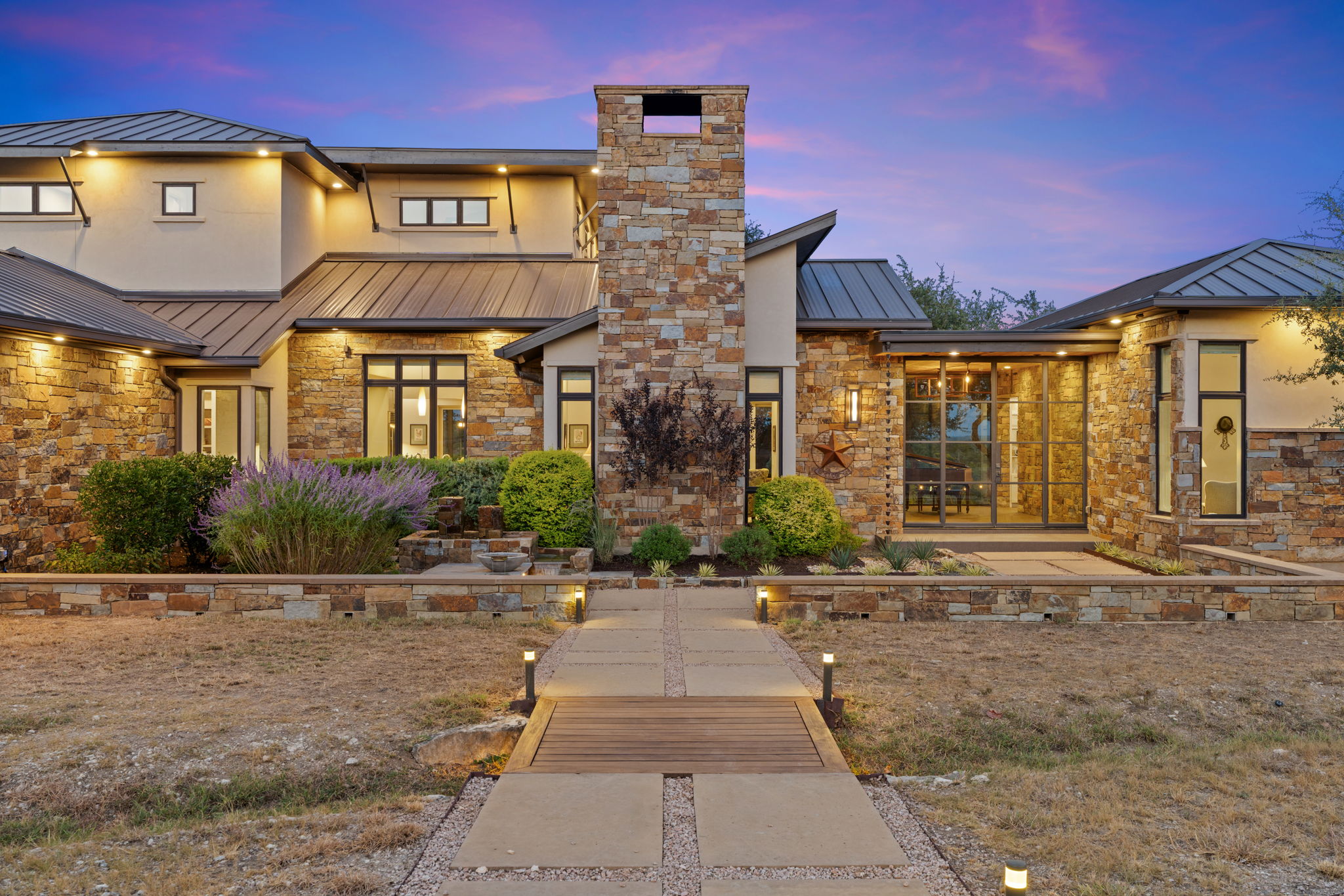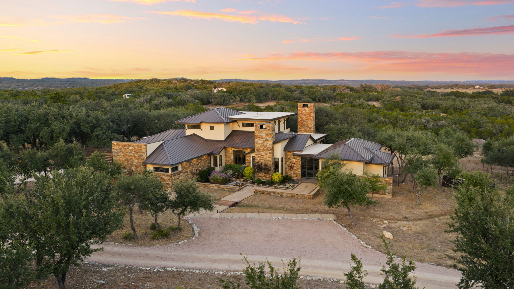 Perched on a ridge in Travis County, the stately residence, built in 2016 by renowned Austin custom home builder Ray Tonjes, commands long-distance views, blending architectural elegance with warm, inviting charm. The home features a stunning stone and stucco façade, complemented by a stone hearth and rich wood floors. Floor-to-ceiling windows greet visitors upon entry, flooding the interior with natural light. The gourmet kitchen is a chef’s dream, equipped with a Wolf range and Subzero refrigerator. The main level includes a luxurious primary suite, a mother-in-law suite, and two private office areas, while upstairs offers two additional bedrooms with a shared living area. All bedrooms feature ensuite baths for ultimate comfort. Additional highlights include an expansive covered outdoor living area with an outdoor kitchen and grill, a well-appointed laundry room with built-ins and a dog door, multiple storage areas, and an oversized three-car garage. The home utilizes a 40,000-gallon rainwater harvesting system, tied into the gutter system, for all water needs.