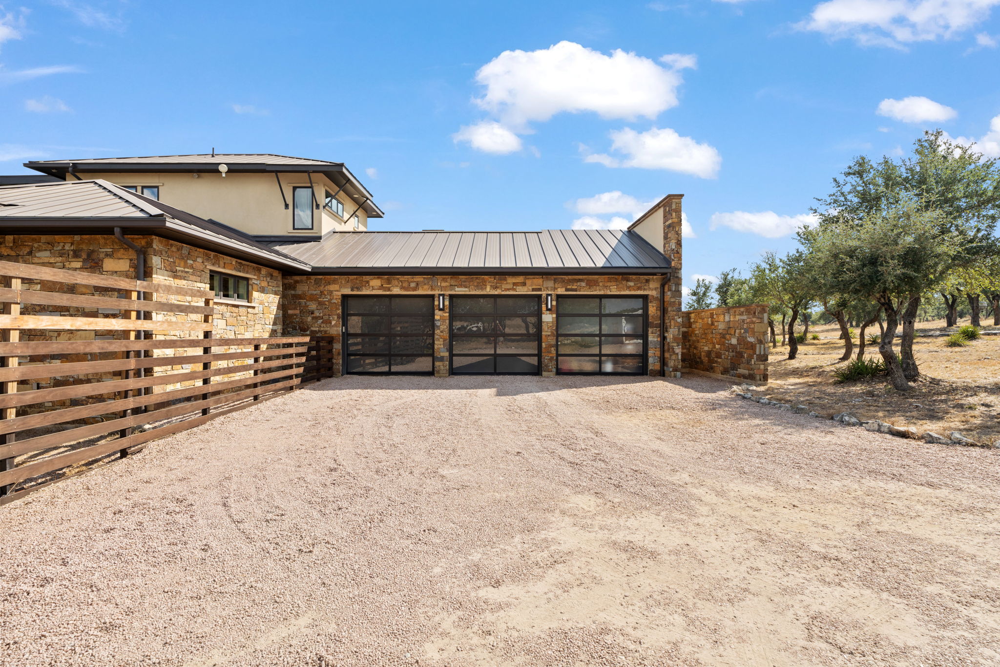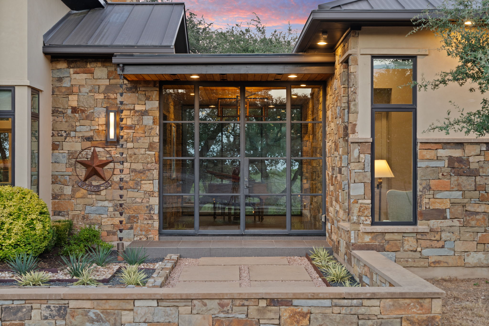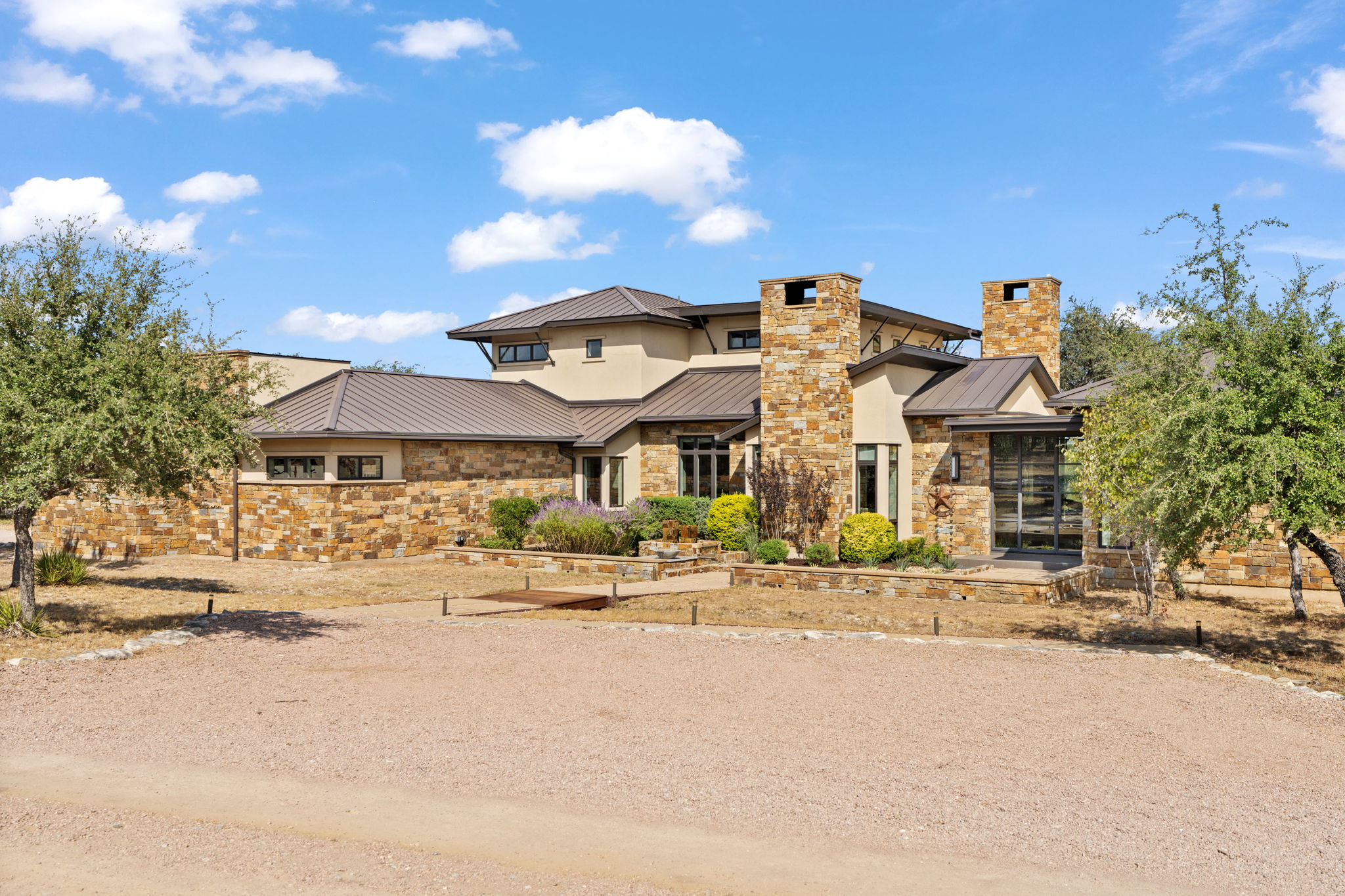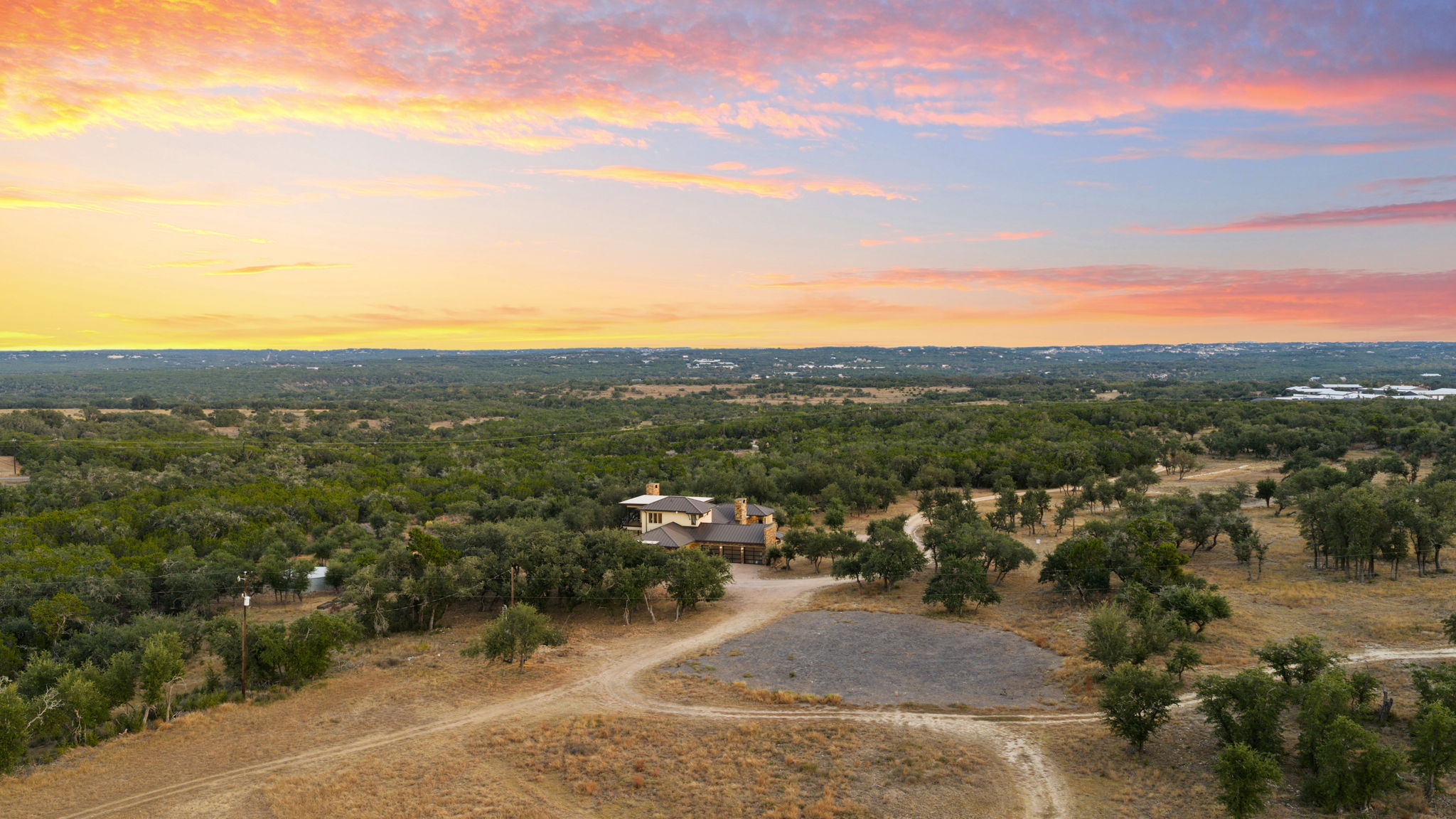 Perched on a ridge in Travis County, the stately residence, built in 2016 by renowned Austin custom home builder Ray Tonjes, commands long-distance views, blending architectural elegance with warm, inviting charm. The home features a stunning stone and stucco façade, complemented by a stone hearth and rich wood floors. Floor-to-ceiling windows greet visitors upon entry, flooding the interior with natural light. The gourmet kitchen is a chef’s dream, equipped with a Wolf range and Subzero refrigerator. The main level includes a luxurious primary suite, a mother-in-law suite, and two private office areas, while upstairs offers two additional bedrooms with a shared living area. All bedrooms feature ensuite baths for ultimate comfort. Additional highlights include an expansive covered outdoor living area with an outdoor kitchen and grill, a well-appointed laundry room with built-ins and a dog door, multiple storage areas, and an oversized three-car garage. The home utilizes a 40,000-gallon rainwater harvesting system, tied into the gutter system, for all water needs.