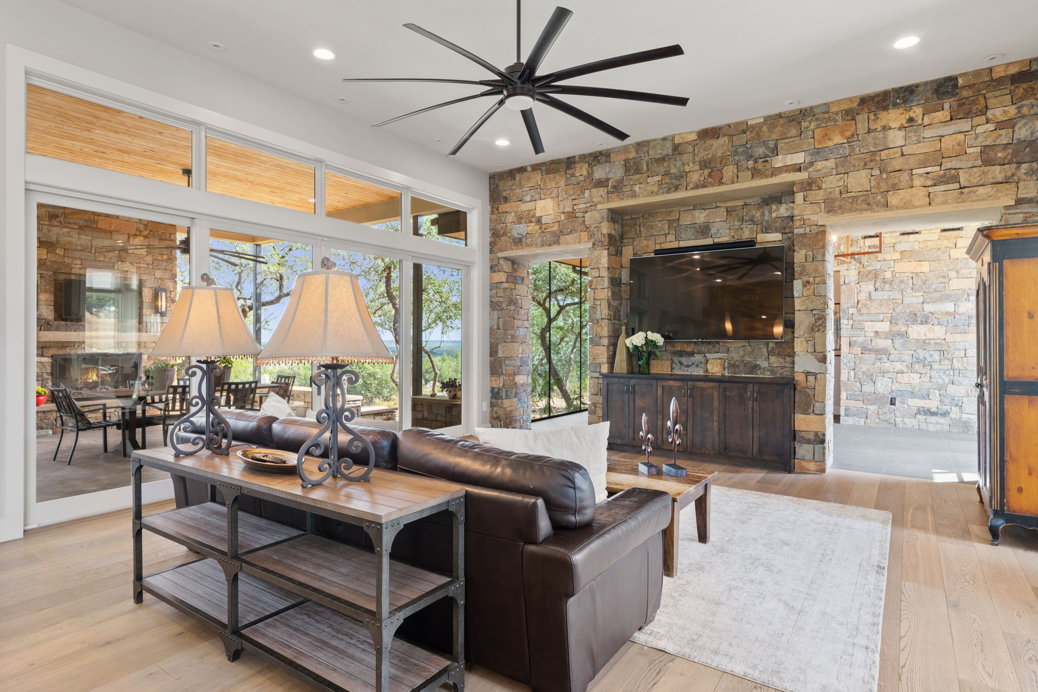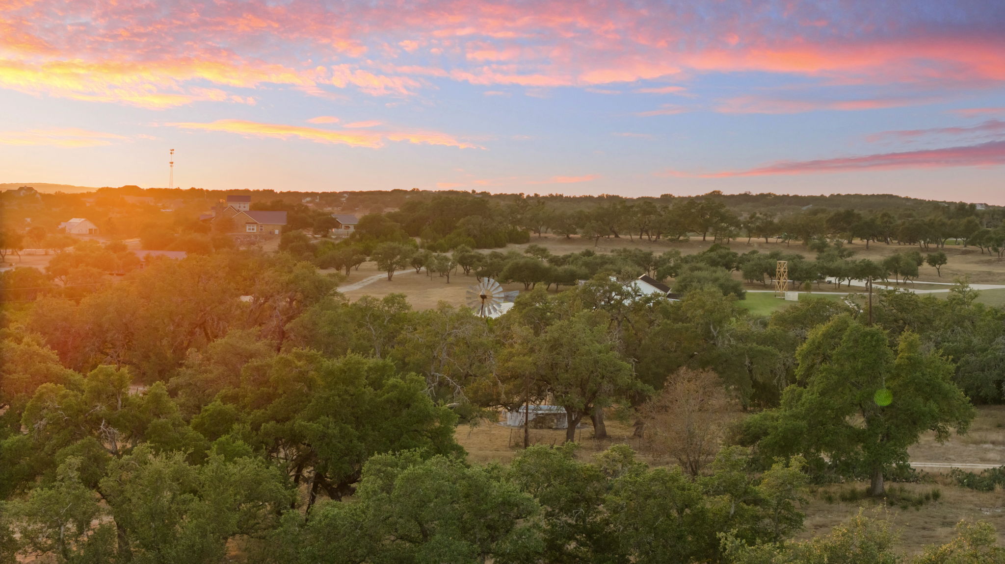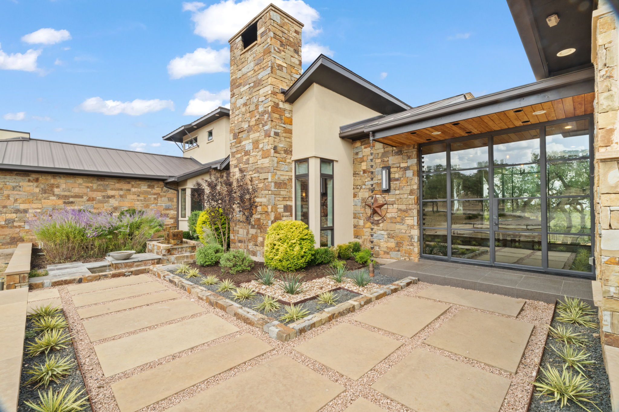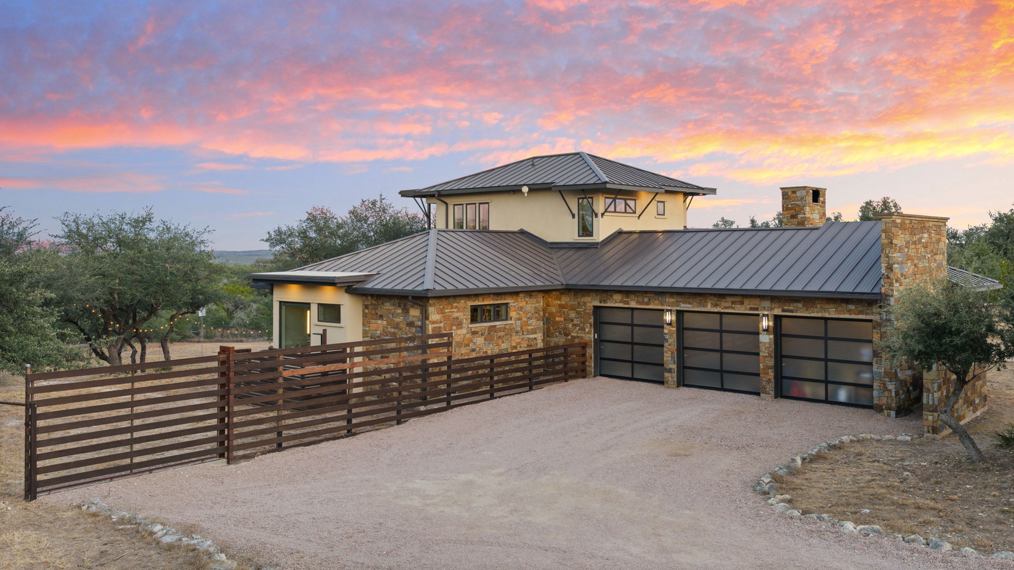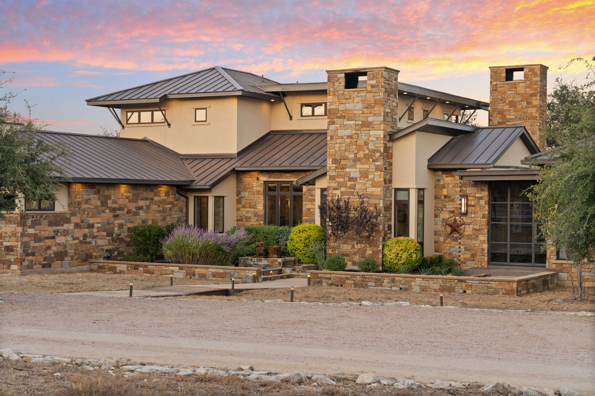 Perched on a ridge in Travis County, the stately residence, built in 2016 by renowned Austin custom home builder Ray Tonjes, commands long-distance views, blending architectural elegance with warm, inviting charm. The home features a stunning stone and stucco façade, complemented by a stone hearth and rich wood floors. Floor-to-ceiling windows greet visitors upon entry, flooding the interior with natural light. The gourmet kitchen is a chef’s dream, equipped with a Wolf range and Subzero refrigerator. The main level includes a luxurious primary suite, a mother-in-law suite, and two private office areas, while upstairs offers two additional bedrooms with a shared living area. All bedrooms feature ensuite baths for ultimate comfort. Additional highlights include an expansive covered outdoor living area with an outdoor kitchen and grill, a well-appointed laundry room with built-ins and a dog door, multiple storage areas, and an oversized three-car garage. The home utilizes a 40,000-gallon rainwater harvesting system, tied into the gutter system, for all water needs.