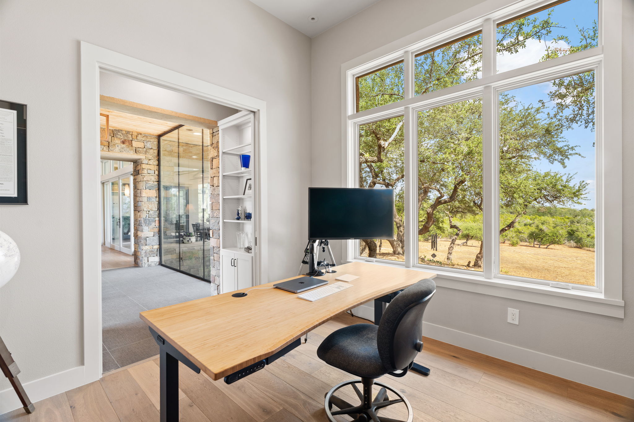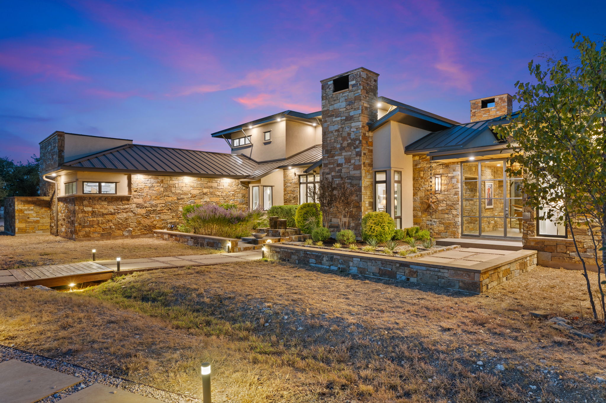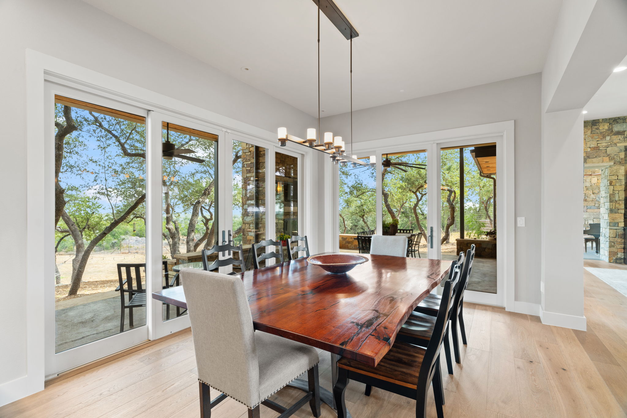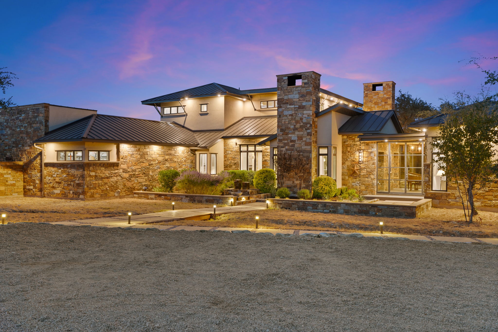 Perched on a ridge in Travis County, the stately residence, built in 2016 by renowned Austin custom home builder Ray Tonjes, commands long-distance views, blending architectural elegance with warm, inviting charm. The home features a stunning stone and stucco façade, complemented by a stone hearth and rich wood floors. Floor-to-ceiling windows greet visitors upon entry, flooding the interior with natural light. The gourmet kitchen is a chef’s dream, equipped with a Wolf range and Subzero refrigerator. The main level includes a luxurious primary suite, a mother-in-law suite, and two private office areas, while upstairs offers two additional bedrooms with a shared living area. All bedrooms feature ensuite baths for ultimate comfort. Additional highlights include an expansive covered outdoor living area with an outdoor kitchen and grill, a well-appointed laundry room with built-ins and a dog door, multiple storage areas, and an oversized three-car garage. The home utilizes a 40,000-gallon rainwater harvesting system, tied into the gutter system, for all water needs.