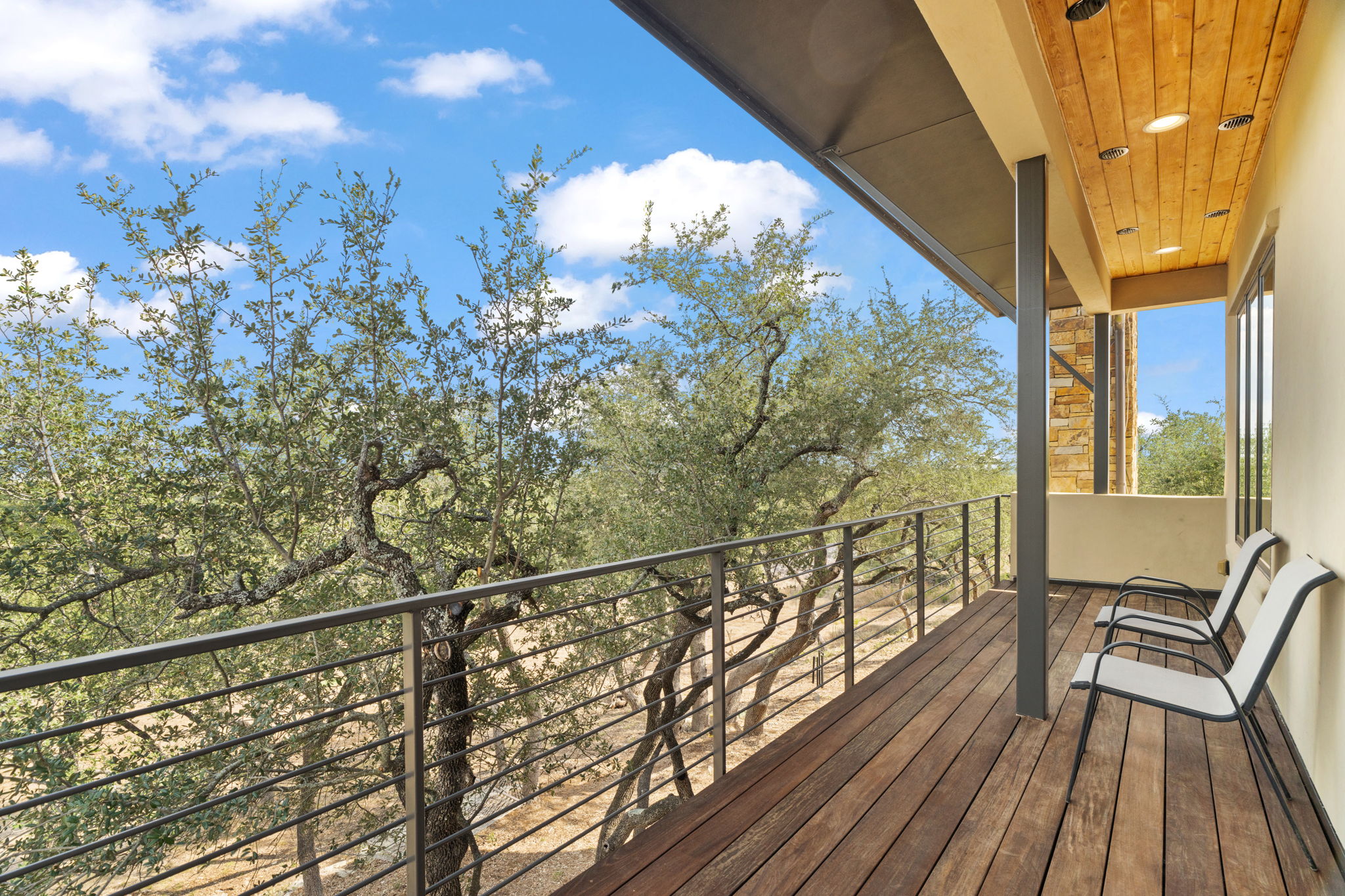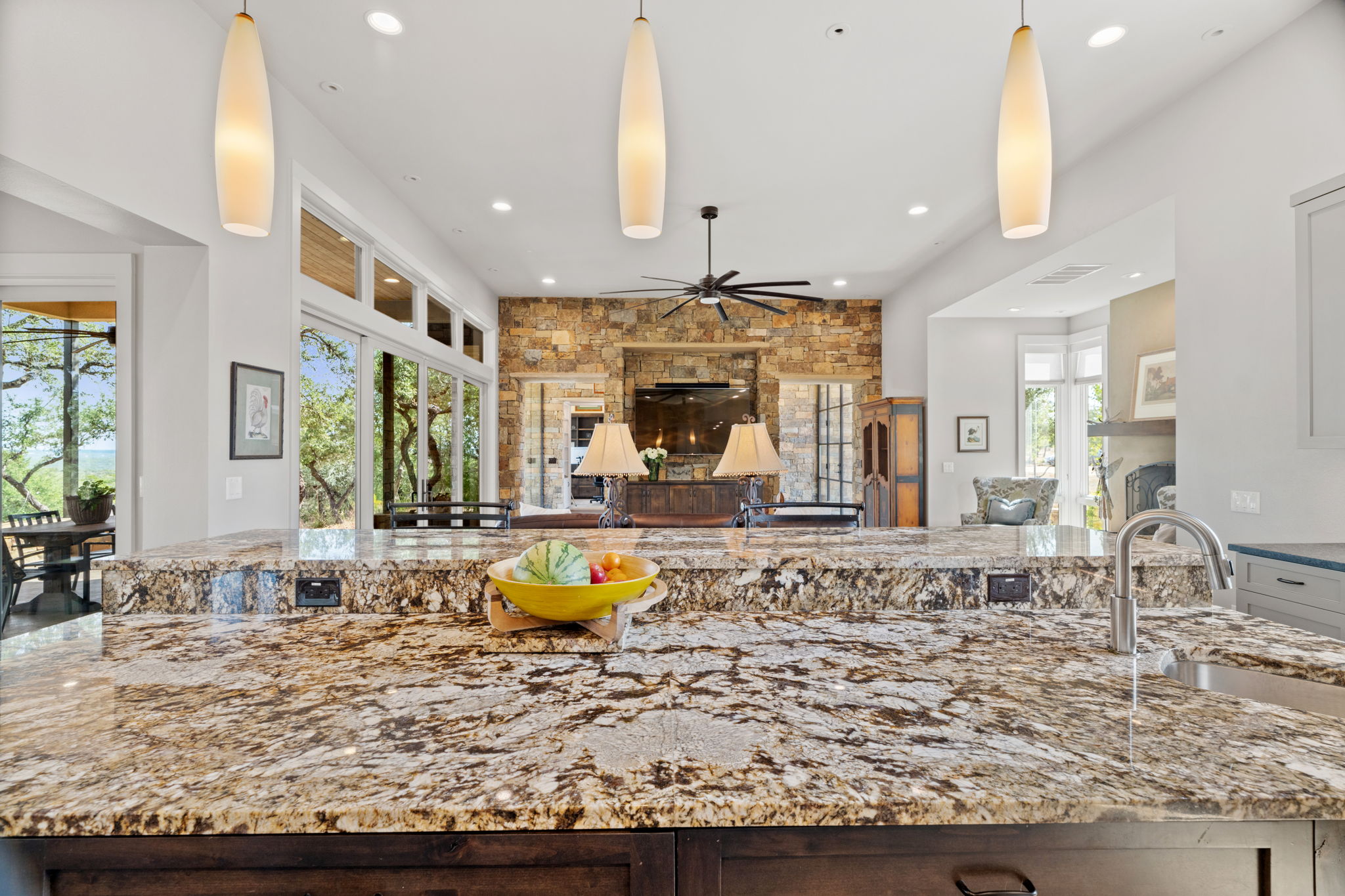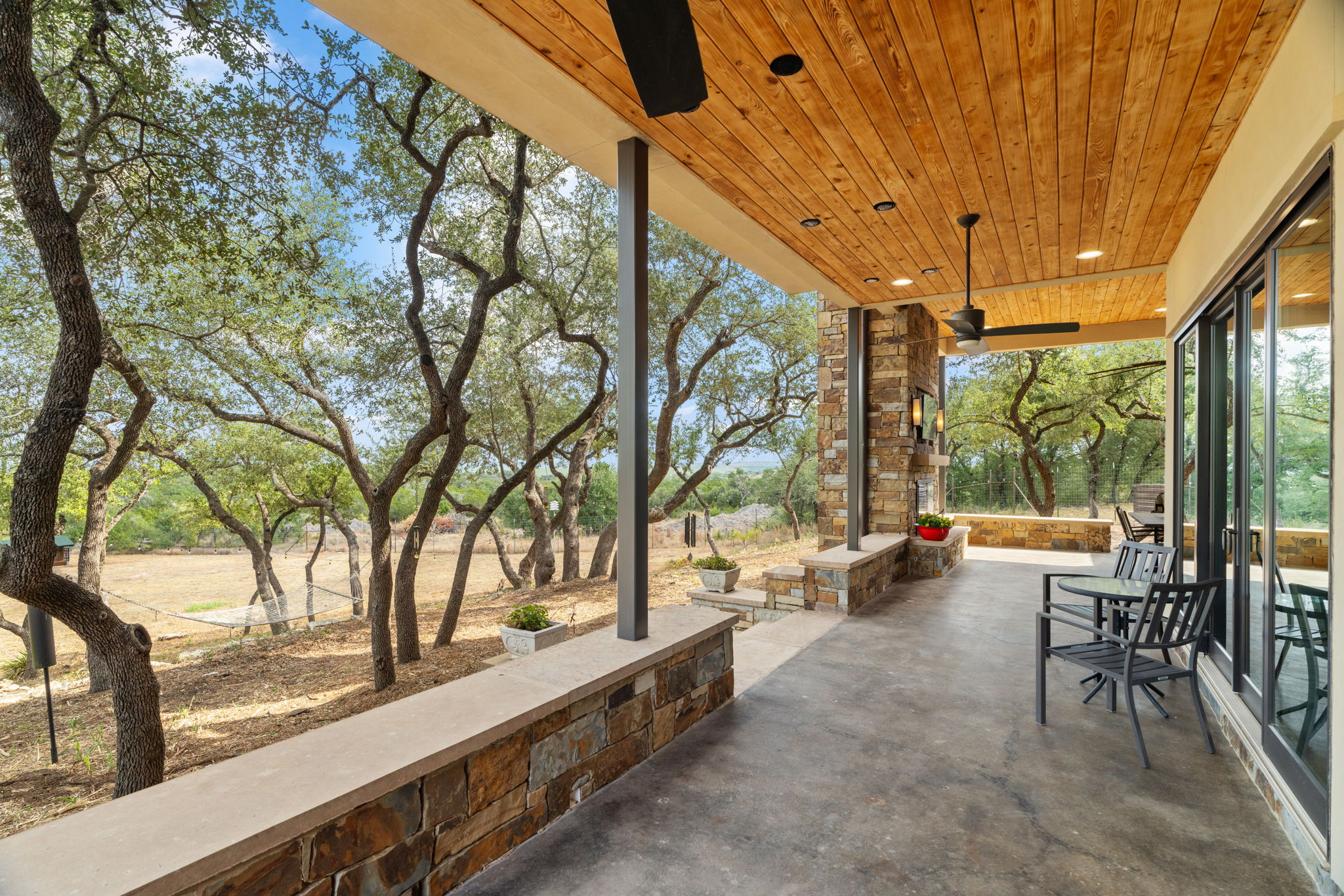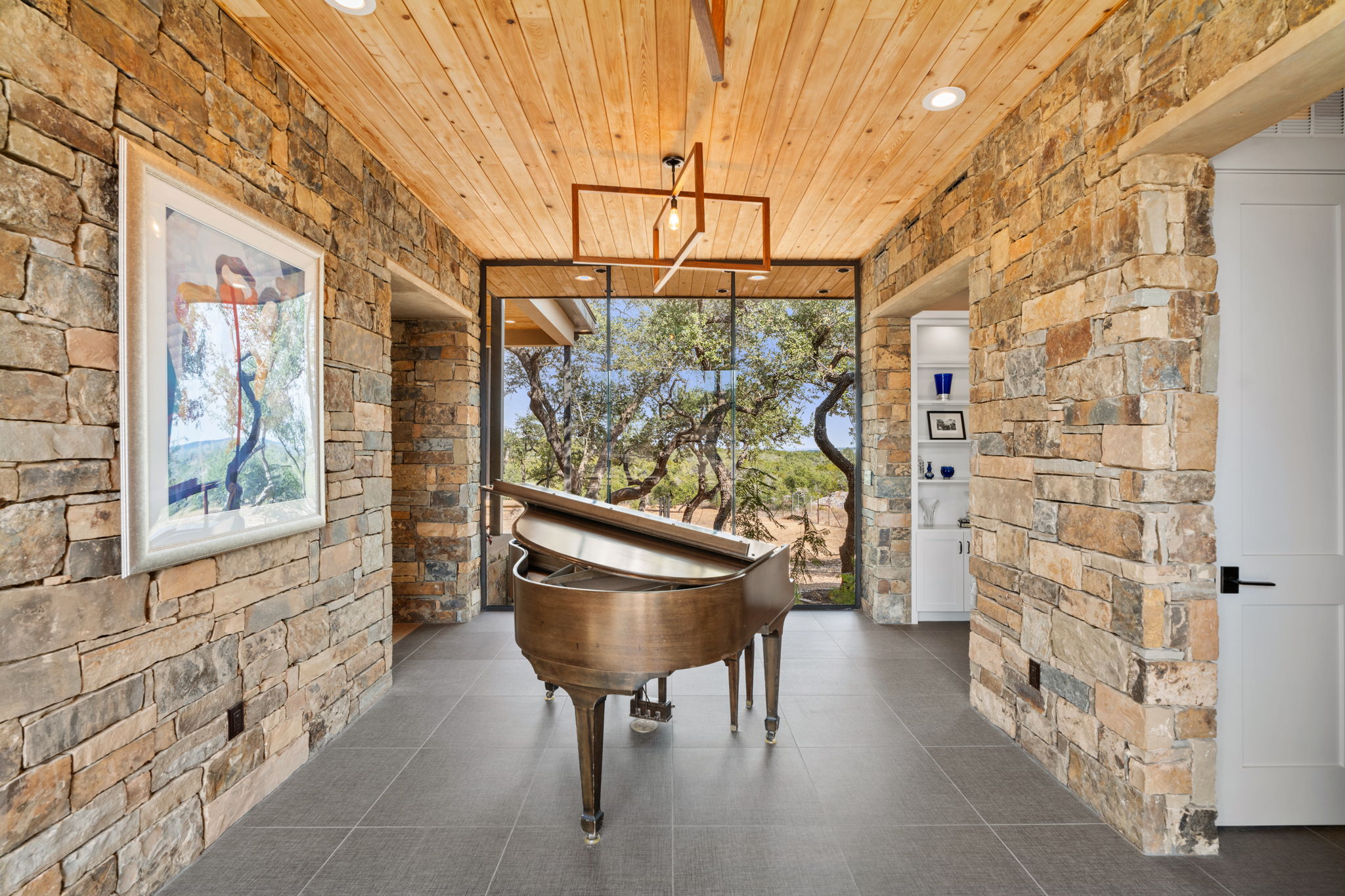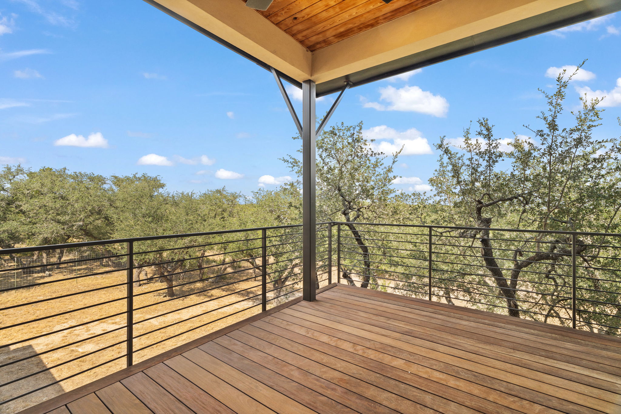 Perched on a ridge in Travis County, the stately residence, built in 2016 by renowned Austin custom home builder Ray Tonjes, commands long-distance views, blending architectural elegance with warm, inviting charm. The home features a stunning stone and stucco façade, complemented by a stone hearth and rich wood floors. Floor-to-ceiling windows greet visitors upon entry, flooding the interior with natural light. The gourmet kitchen is a chef’s dream, equipped with a Wolf range and Subzero refrigerator. The main level includes a luxurious primary suite, a mother-in-law suite, and two private office areas, while upstairs offers two additional bedrooms with a shared living area. All bedrooms feature ensuite baths for ultimate comfort. Additional highlights include an expansive covered outdoor living area with an outdoor kitchen and grill, a well-appointed laundry room with built-ins and a dog door, multiple storage areas, and an oversized three-car garage. The home utilizes a 40,000-gallon rainwater harvesting system, tied into the gutter system, for all water needs.