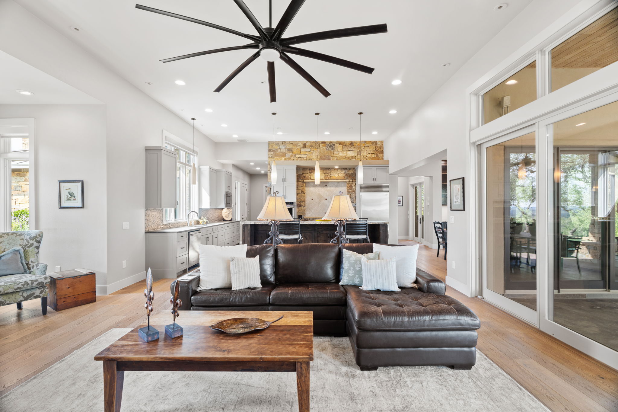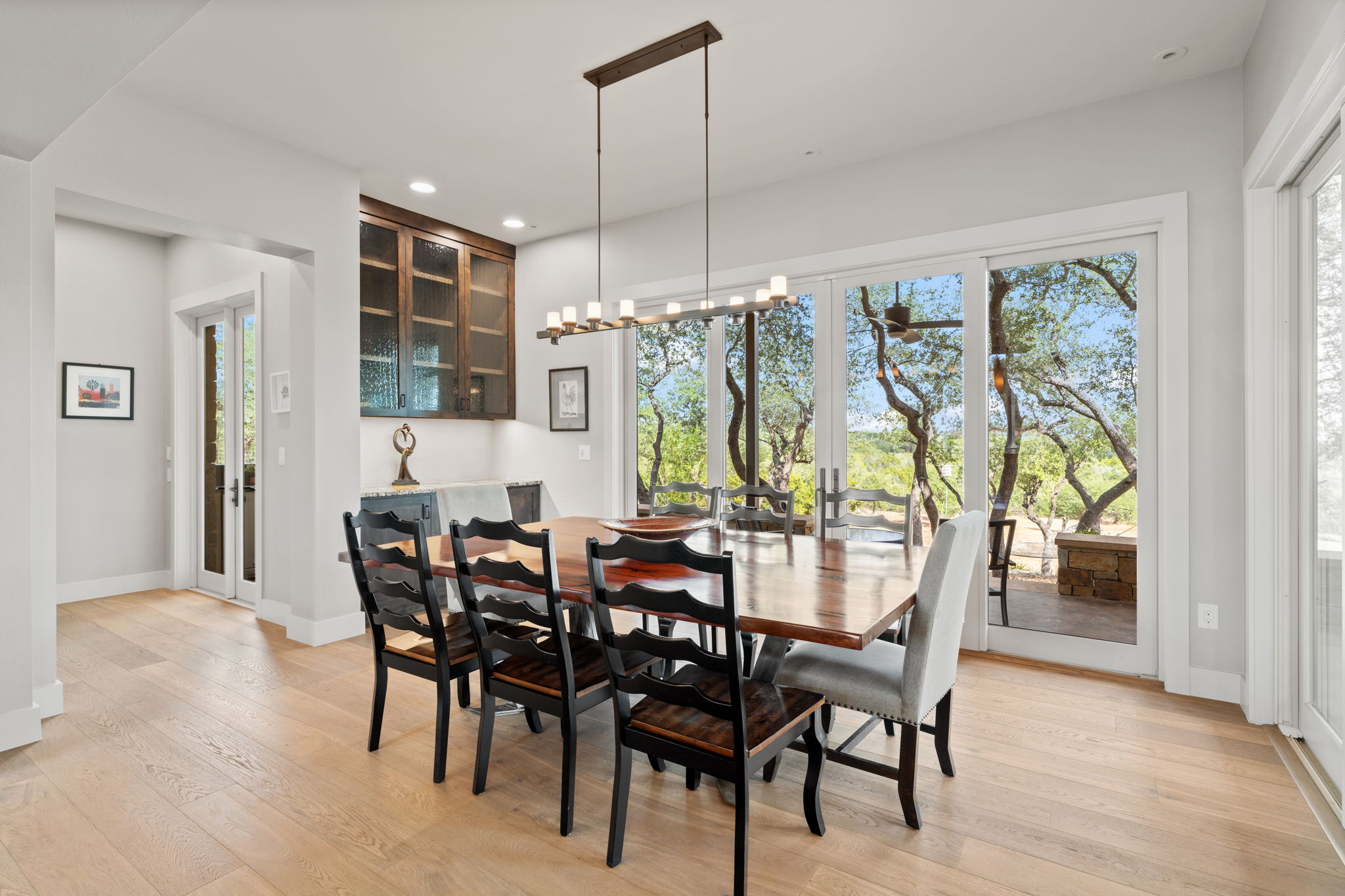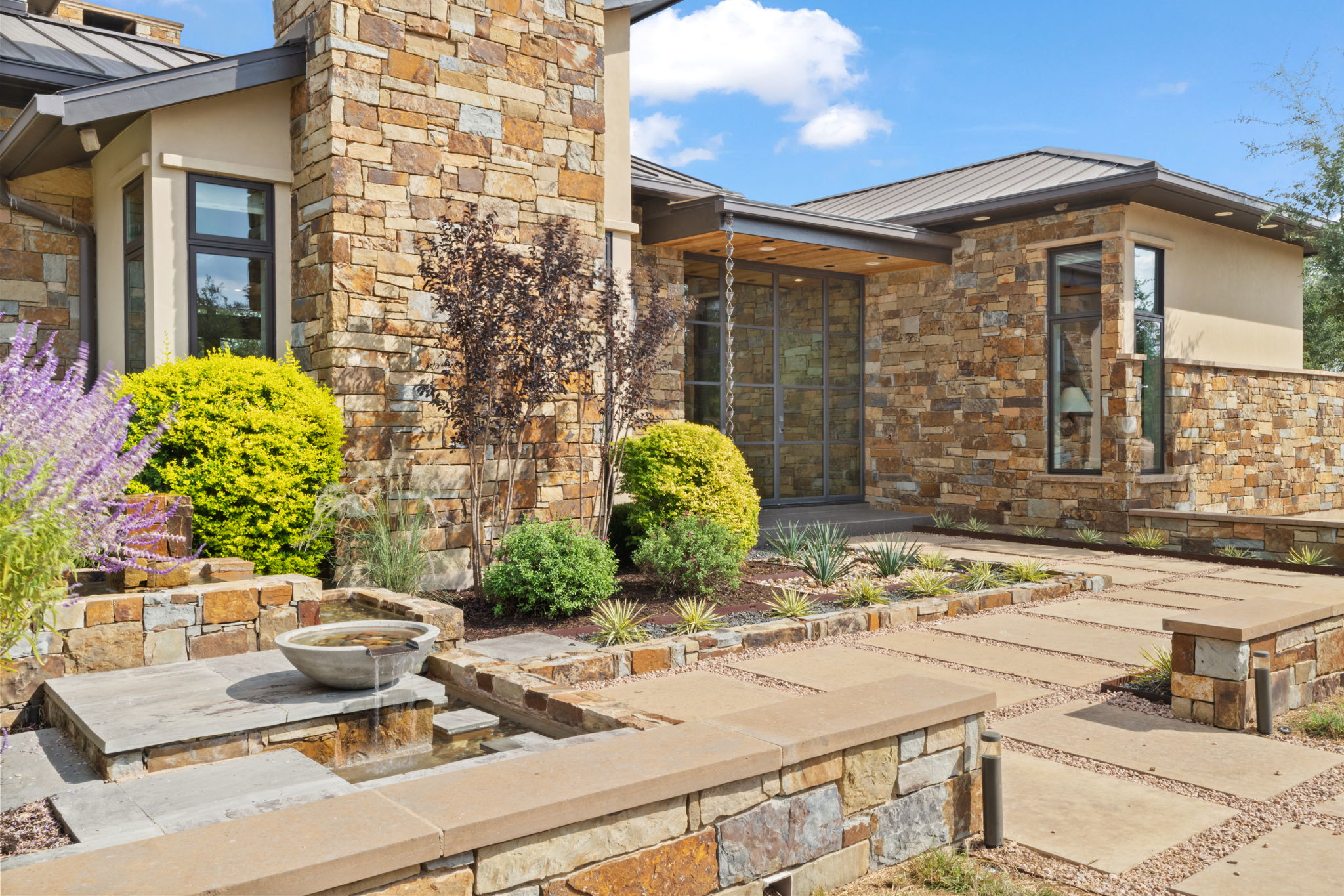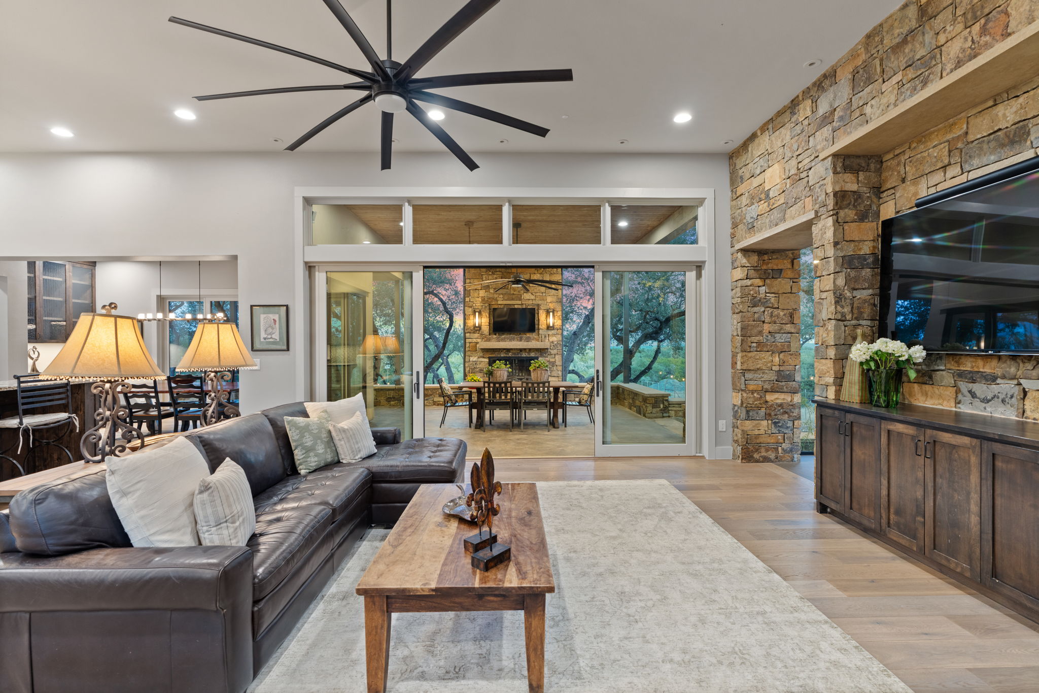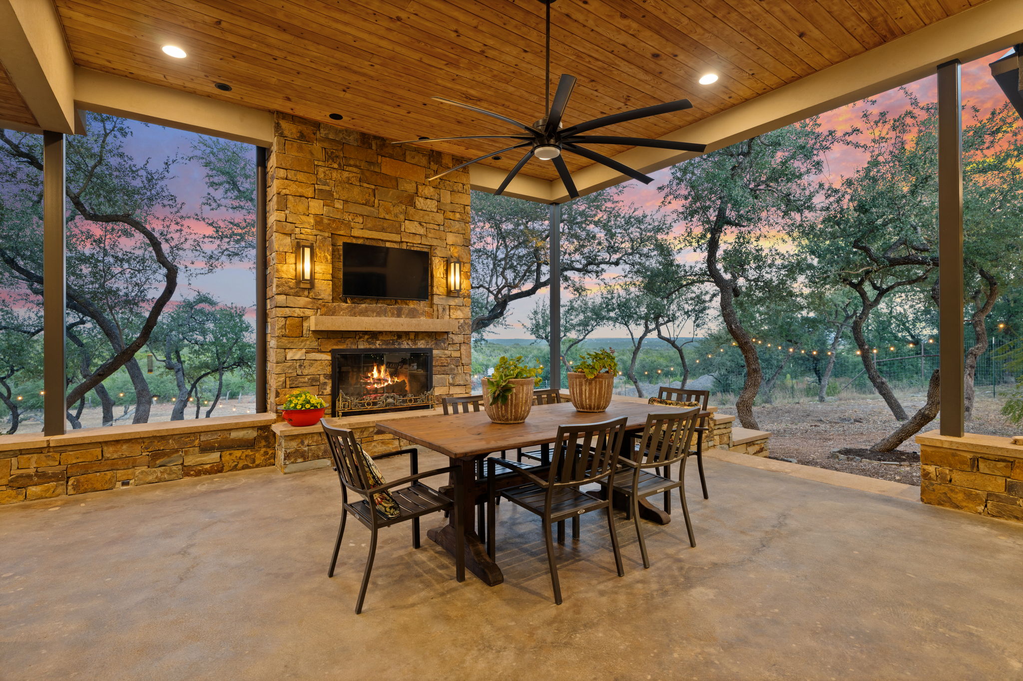 Perched on a ridge in Travis County, the stately residence, built in 2016 by renowned Austin custom home builder Ray Tonjes, commands long-distance views, blending architectural elegance with warm, inviting charm. The home features a stunning stone and stucco façade, complemented by a stone hearth and rich wood floors. Floor-to-ceiling windows greet visitors upon entry, flooding the interior with natural light. The gourmet kitchen is a chef’s dream, equipped with a Wolf range and Subzero refrigerator. The main level includes a luxurious primary suite, a mother-in-law suite, and two private office areas, while upstairs offers two additional bedrooms with a shared living area. All bedrooms feature ensuite baths for ultimate comfort. Additional highlights include an expansive covered outdoor living area with an outdoor kitchen and grill, a well-appointed laundry room with built-ins and a dog door, multiple storage areas, and an oversized three-car garage. The home utilizes a 40,000-gallon rainwater harvesting system, tied into the gutter system, for all water needs.